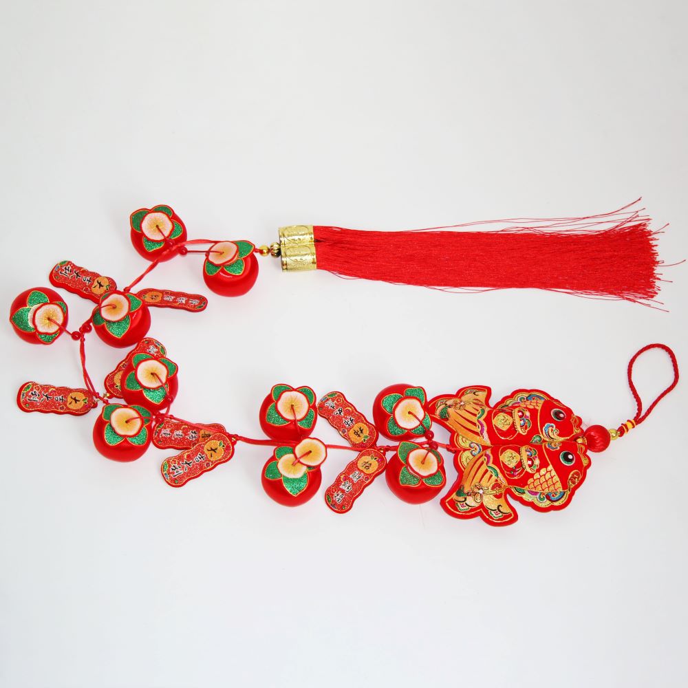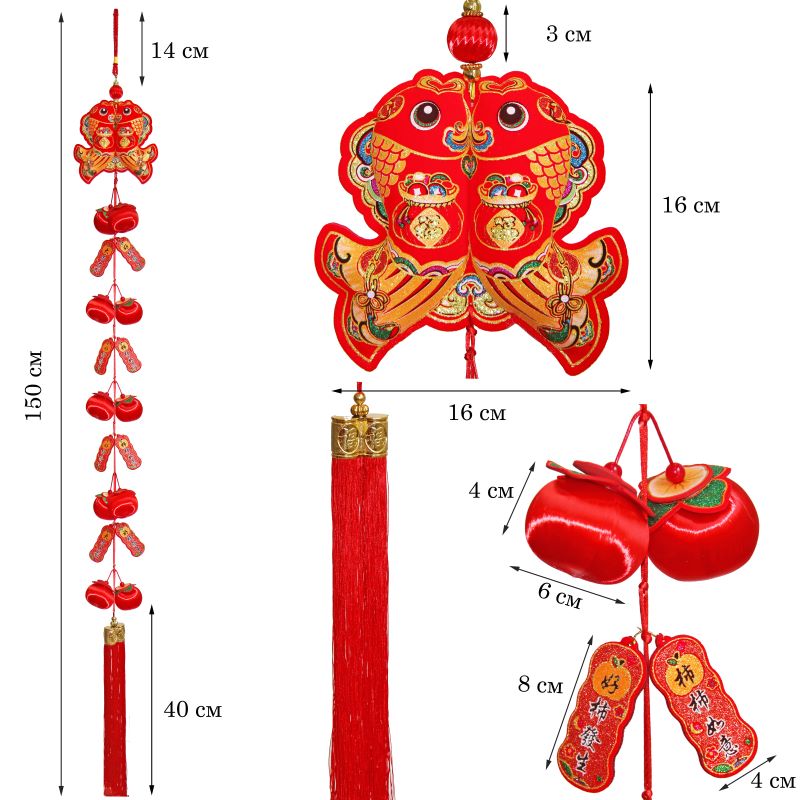 Символика подвески включает красные яблоки, которые олицетворяют гармонию, мир и процветание, иероглифы на листьях — благополучие, а двойная рыбка — супружеское счастье и изобилие.