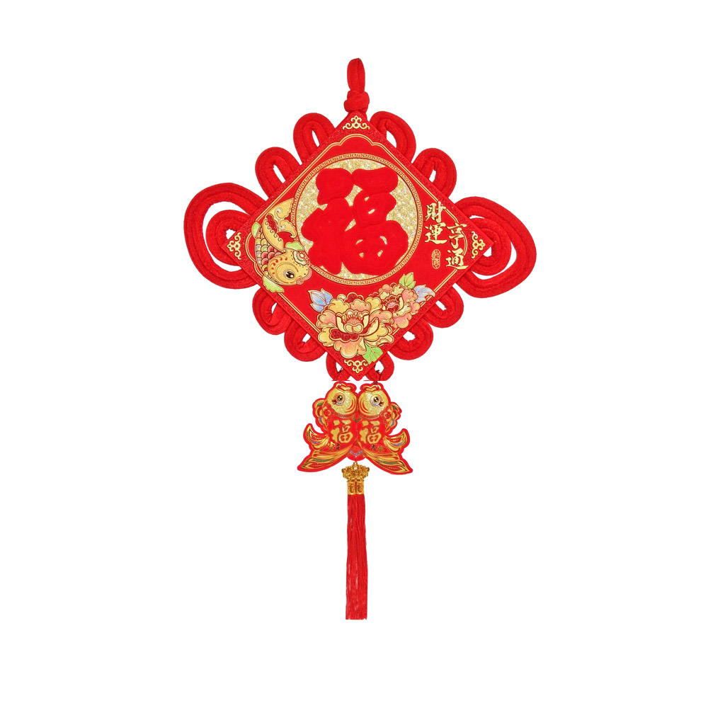 Традиционный китайский узел в форме ромба с символичным дизайном. Яркое сочетание красного бархата и золотых элементов создает эффектный акцент в интерьере.