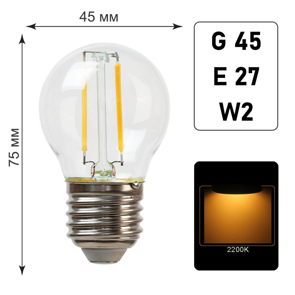 Лампа светодиодная стандарта G45 E27 с потребляемой мощностью 2 Вт. По степени интенсивности излучаемого света заменяет традиционные лампы мощностью до 25 Вт. Является декоративной и используется в гирляндах и светильниках как внутри, так и снаружи помещений. Длительность работы – до 25 тысяч часов. Не содержит вредных для экологии соединений.