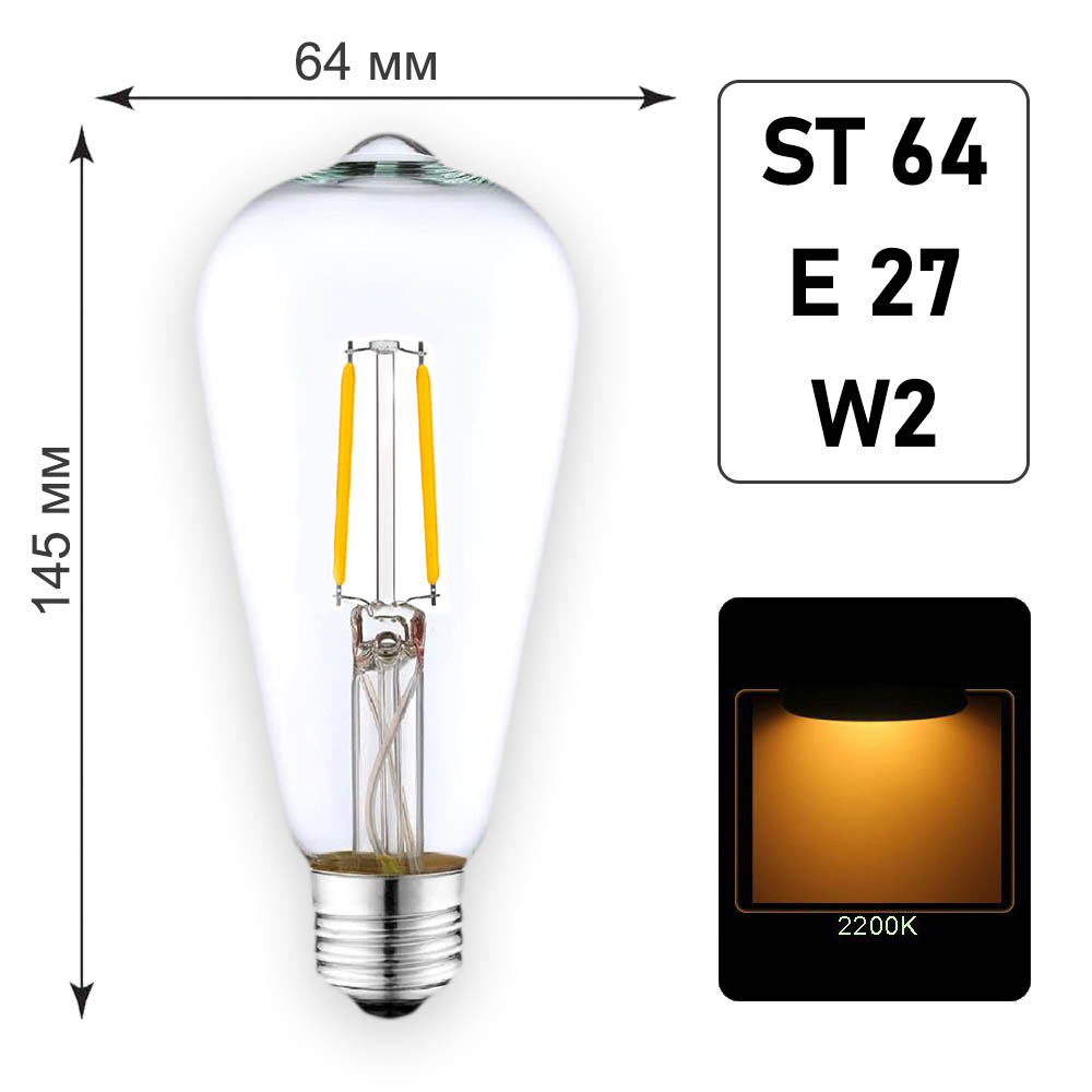 Лампа светодиодная ST64 со стандартом патрона E27 W2 и тёплым свечением 2200К.  Световой поток (lm): 360 – этого вполне хватит для создания уютной атмосферы. Высокие показатели энергосбережения и низкое потребление электричества – мощность 4Вт.  Гарантировано длительный срок службы – свыше 25 тысяч часов.