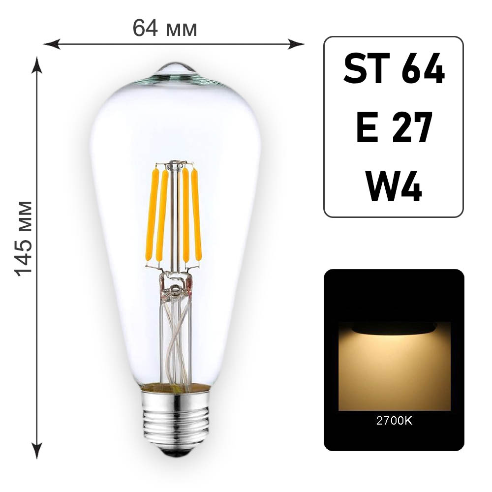 Лампа светодиодная ST64 E27 W4 – винтажный источник света с интенсивностью 2700K. Предназначена для установки в осветительных приборах кафе и ресторанов, магазинов и холлов, в стендах и гирляндах. Предназначена для установки в патрон E27. Характеризуется высокой энергоэфективностью и длительным сроком службы – свыше 20 000 часов