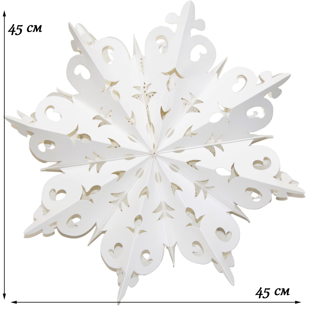 Снежинка на липучках размером 45 см, белого цвета, изготовлена из высококачественной бумаги.