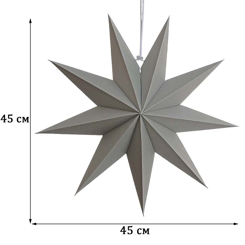 Объёмная девятиконечная звезда 45 см — декоративный элемент для интерьера и праздничного оформления. Лёгкая интерьерная звезда из картона хорошо держит форму и создаёт выразительный объём. Поставляется в сложенном виде, в комплекте шнур для фиксации объёма и подвеса.