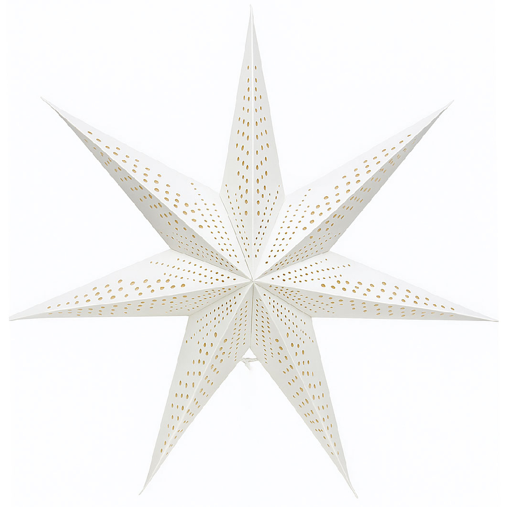 Воздушная семиконечная звезда из плотной бумаги с изящным орнаментом в виде кружочков. Белоснежный цвет и аккуратная перфорация создают мягкое свечение и добавляют интерьеру лёгкость и праздничное настроение.