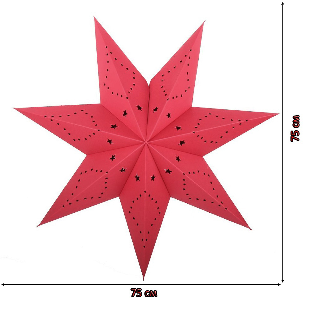 Семиконечная объемная звезда 75 см — великолепный декор из тонкого перфорированного картона. Создает красивые световые эффекты. Поставляется в сложенном виде, в комплекте шнур для фиксации объема и подвеса.